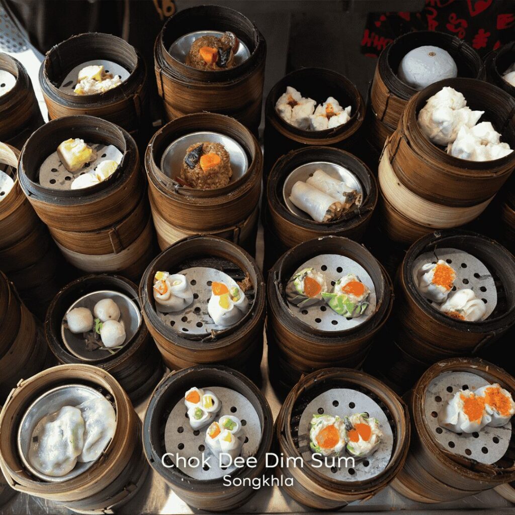À Hat Yai, le dim sum occupe une place centrale dans la culture matinale. Ici, l’expérience se distingue des chariots typiques de Hong Kong. Les visiteurs choisissent directement leurs petites coupelles de raviolis crus disposées près des grands cuiseurs vapeur. Chaque assiette est ensuite préparée à la demande, garantissant fraîcheur et authenticité.